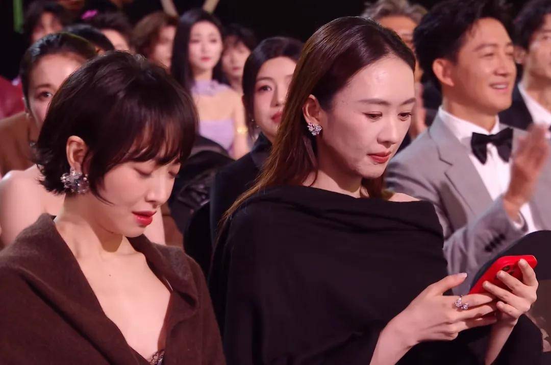 张凌赫上台领奖,白鹿直接低头玩起手机,似乎也很怕导播乱切。